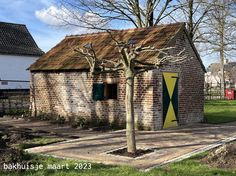 De pilasters zijn volledig vrijgemaakt en voorzien van een Corten stalen poort met eiermotief. Een pad leidt direct naar het bakhuisje waarvoor een dakplataan is geplant die op het binnenterrein bij de Thooren stond.